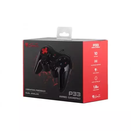 De controller beschikt over twee analoge sticks, een 8‑richtingen D‑pad, triggers, schouderknoppen en een volledige set actieknoppen. De ingebouwde vibratiefunctie zorgt voor extra beleving tijdens het gamen. Plug‑and‑play installatie maakt de Genesis P33 eenvoudig in gebruik op de meeste Windows‑systemen.