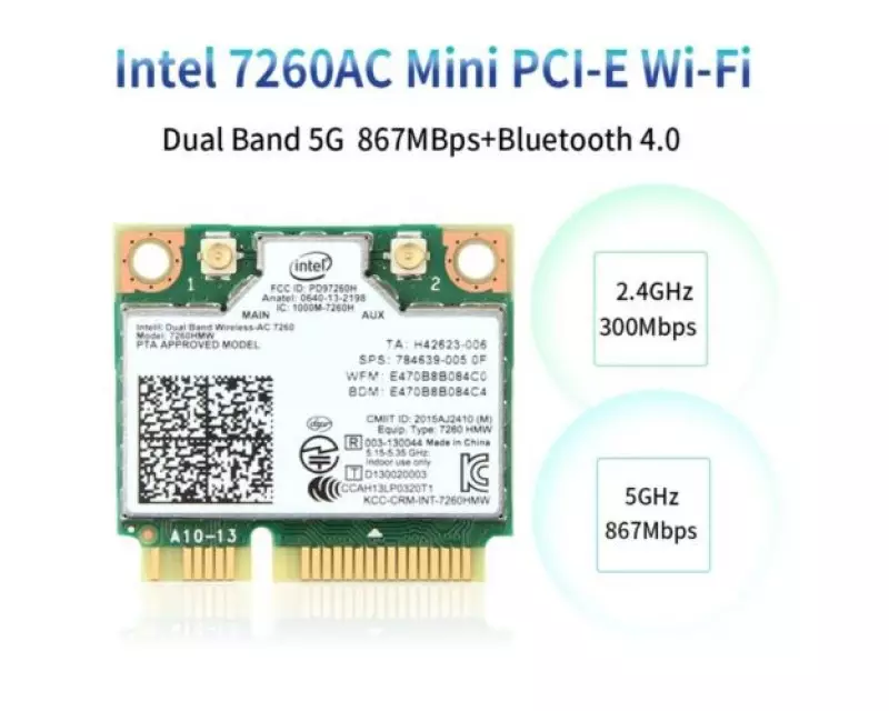 - Intel 7260HMW Mini PCI-E 7260 Dual Band 2.4G/5Ghz Wlan.